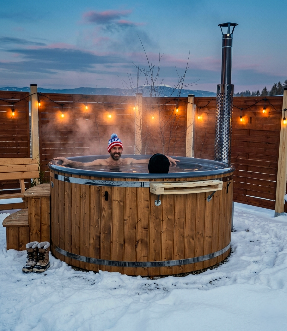 Gorąca balia ogrodowa to idealny sposób na relaks podczas pobytu w naszym domku -odprężenie, cisza i regeneracja o każdej porze roku.
